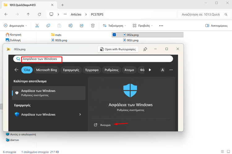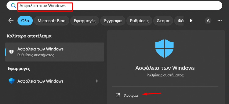 Αρχικά, πληκτρολογούμε στην αναζήτηση “Ασφάλεια των Windows” και πατάμε “Άνοιγμα”.