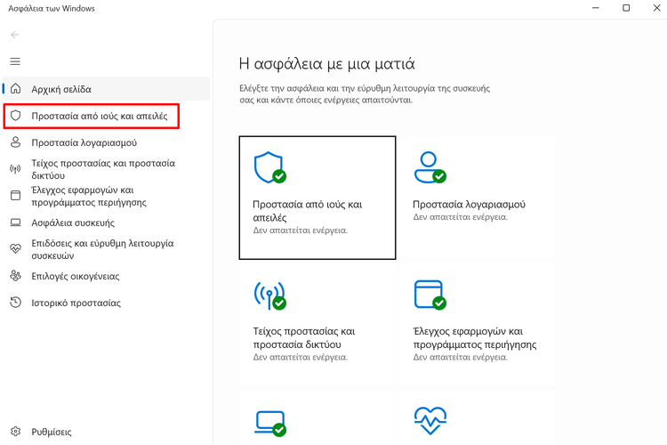 Έπειτα, κάνουμε κλικ στο “Προστασία από ιούς και απειλές”.