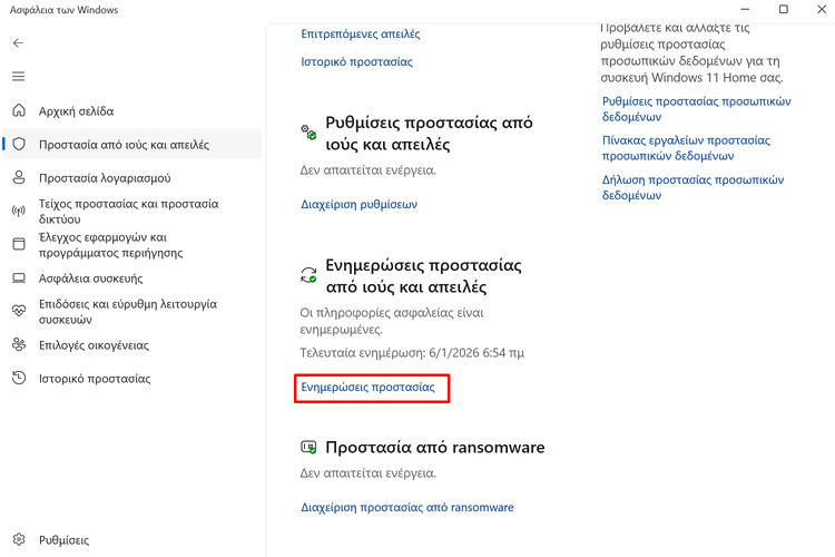 Στη συνέχεια, εντοπίζουμε την ενότητα “Ενημερώσεις προστασίας από ιούς και απειλές” και πατάμε τον σύνδεσμο “Ενημερώσεις προστασίας”.