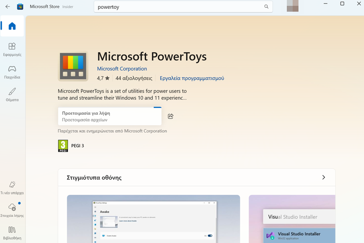 Αρχικά, εγκαθιστούμε το Microsoft PowerToys από το Microsoft Store.