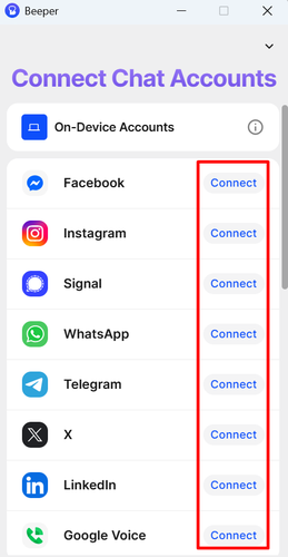 Στη συνέχεια, πατάμε το κουμπί “Connect” δίπλα σε κάθε εφαρμογή που θέλουμε να προσθέσουμε στο Beeper και ακολουθούμε τις οδηγίες για να συνδέσουμε τον ανάλογο λογαριασμό.