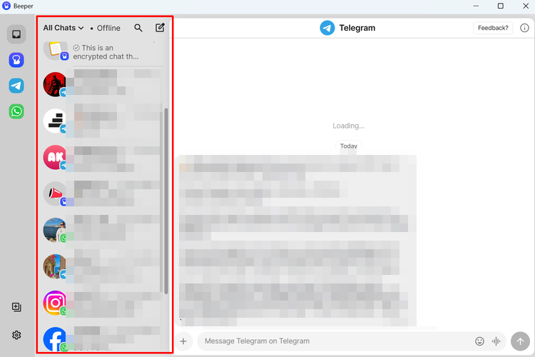 Στο παράθυρο του Beeper βλέπουμε δεξιά όλες τις συνομιλίες από όλες τις εφαρμογές που συνδέσαμε.