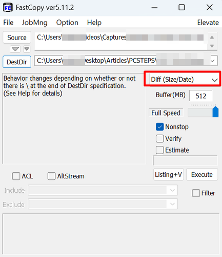 Μετά, επιλέγουμε τη λειτουργία “Diff (Size/Date)” για να αντιγράψουμε μόνο τα νέα ή τροποποιημένα αρχεία.
