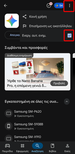Έπειτα, πατάμε τις τρεις τελείες στην επάνω δεξιά γωνία και επιλέγουμε το κουτάκι δίπλα στο “Ενεργοποίηση αυτόματων ενημερώσεων”.