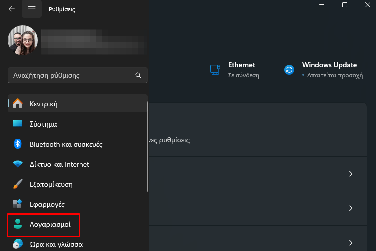 Μία άλλη αιτία για το αυτόματο κλείδωμα του υπολογιστή μπορεί να είναι οι ρυθμίσεις που έχουμε κάνει για τη σύνδεση μας στο σύστημα. Για να ελέγξουμε και να τροποποιήσουμε αυτές τις ρυθμίσεις, ανοίγουμε τις ρυθμίσεις των Windows 11 και πατάμε “Λογαριασμοί”.