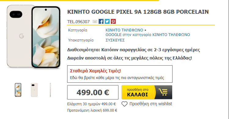 €499,00 Google Pixel 9A, 6.3″120Hz P-OLED, 8GB/128GB, 5100mAh, Android 15