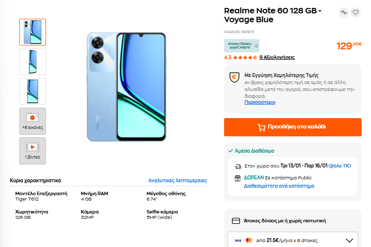 €129,00 Realme Note 60, 6.74″ 90Hz  4GB / 128GB / 5000mAh
