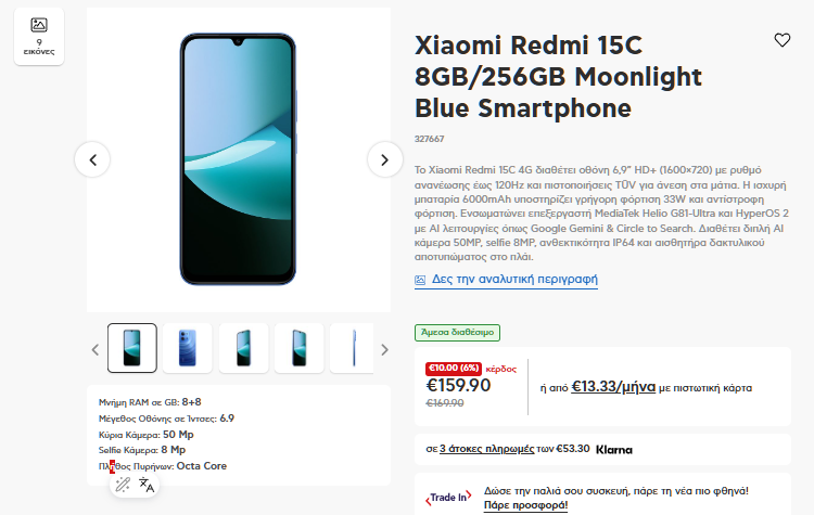 Το Xiaomi Redmi 15C έρχεται με μεγάλη οθόνη 120Hz 6.9” HD+ και μπαταρία 6000mAh. Υποστηρίζει γρήγορη φόρτιση33W, και διαθέτει 8GB μνήμη RAM, 259GB αποθηκευτικό χώρο