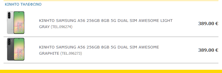 €389,00 Galaxy Α56, 6.7″FHD+120Hz AMOLED, 8GB/256GB, 5000mAh, Android 14