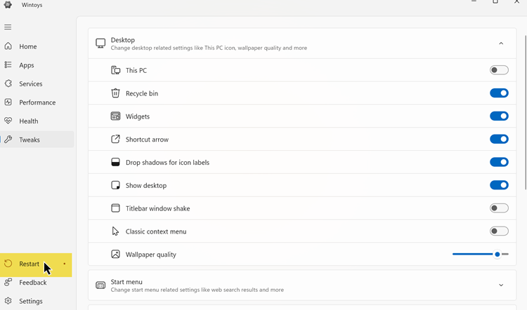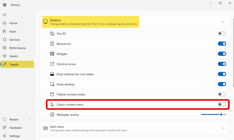 Στην ενότητα Desktop θα βρούμε ρυθμίσεις όπως η επαναφορά του κλασικού μενού δεξιού κλικ, η απόκρυψη των Widgets, καθώς και επιλογές για την προσαρμογή της εμφάνισης της επιφάνειας εργασίας.