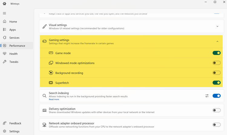 Στην ενότητα του Performance θα βρούμε και επιλογές για βελτίωση των επιδόσεων κατά το gaming. Μπορούμε, για παράδειγμα, να ενεργοποιήσουμε το Gaming mode των Windows, ή να απενεργοποιήσουμε την υπηρεσία Superfetch για ακόμα καλύτερη απόδοση στα παιχνίδια.