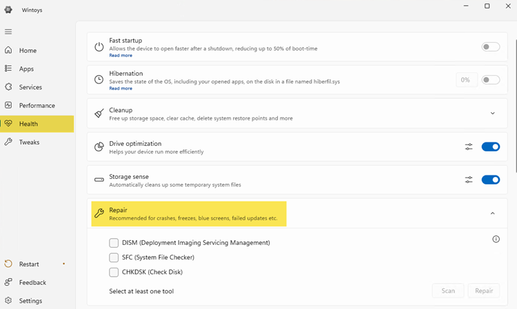 Πρόκειται για την ενότητα Repair, η οποία περιλαμβάνει τα εργαλεία SFC, DISM και CHKDSK, που ελέγχουν και επιδιορθώνουν κρίσιμα σφάλματα του συστήματος. Το Wintoys επιτρέπει την εκτέλεσή τους με ένα μόνο κλικ, χωρίς ανάγκη χρήσης της γραμμής εντολών, προσφέροντας έτσι εύκολη και ασφαλή συντήρηση του υπολογιστή.