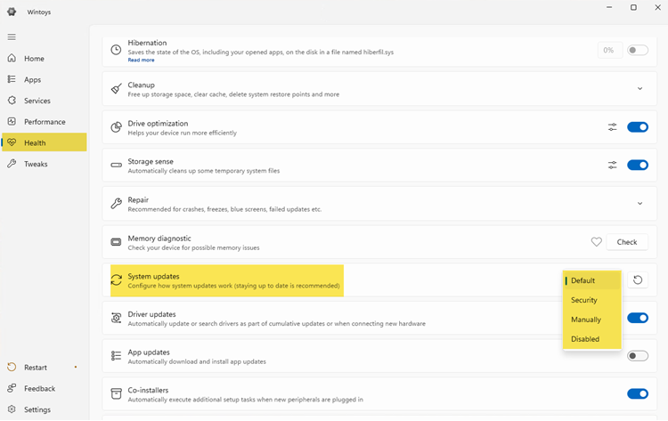 Σημαντική είναι επίσης και η δυνατότητα διαχείρισης των ενημερώσεων των Windows, καθώς το Wintoys επιτρέπει την προσωρινή ή πλήρη απενεργοποίηση τους χωρίς να απαιτούνται παρεμβάσεις στο μητρώο ή ριζικές αλλαγές στο σύστημα.