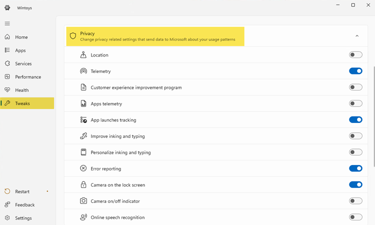 Με το Wintoys, μπορούμε εύκολα να μεταβούμε στις Ρυθμίσεις Απόρρητου (Privacy) και να δούμε συγκεντρωμένα τα δεδομένα που συλλέγει η Microsoft, περιορίζοντας τη χρήση τους.