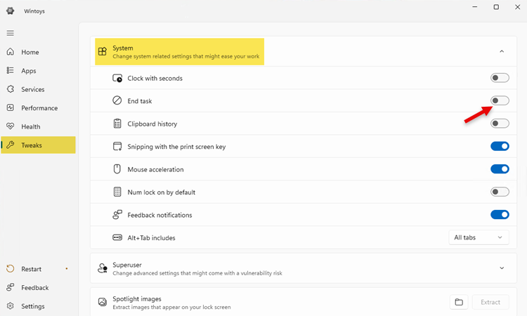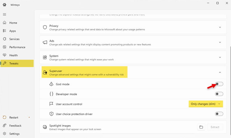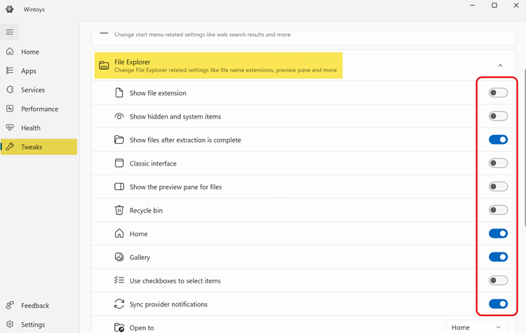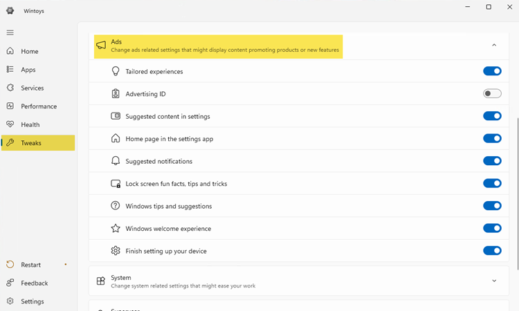 Τα Windows προσφέρουν πολλούς τρόπους προσαρμογής, αλλά η διαδικασία μέσα από τις Ρυθμίσεις μπορεί να είναι χρονοβόρα. Με το Wintoys, όλα γίνονται απλά και άμεσα μέσα από την καρτέλα Tweeks.