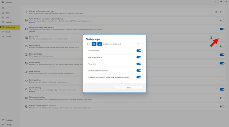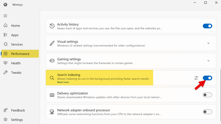 Πολλές εφαρμογές και διεργασίες εκτελούνται στο παρασκήνιο των Windows και μπορούν να επιβραδύνουν το σύστημά μας. Αντί να ψάχνουμε σε Πίνακα Ελέγχου, Επεξεργαστή Μητρώου ή Ρυθμίσεις, το Wintoys συγκεντρώνει όλες τις επιλογές στην καρτέλα Performance, για βελτίωση Windows.