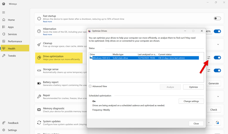 Χρησιμοποιώντας την επιλογή Drive Optimization, διασφαλίζουμε τη βέλτιστη απόδοση του δίσκου, ενώ μέσω του εργαλείου ελέγχου μνήμης μπορούμε να εντοπίσουμε πιθανά σφάλματα στη RAM.