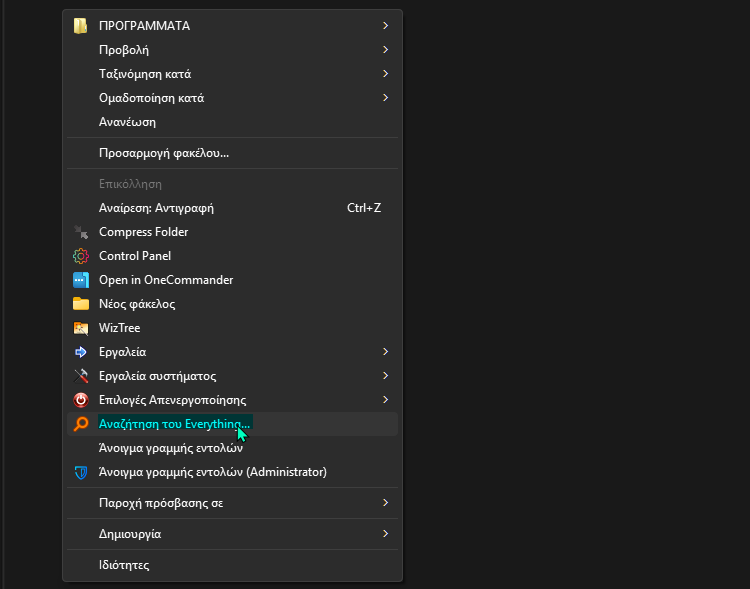Εναλλακτικά, αντί να έχουμε ενεργό το indexing, μπορούμε να χρησιμοποιήσουμε το πιο ελαφρύ Everything, που ενσωματώνεται με δεξί κλικ και στην Εξερεύνηση αρχείων.
