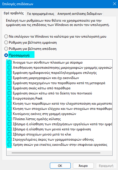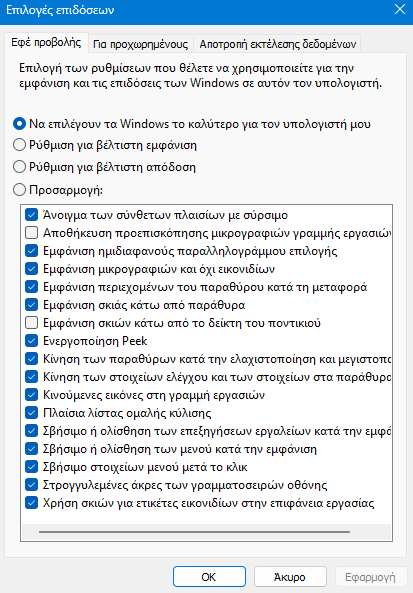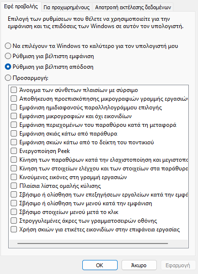 Εάν το σύστημά μας είναι παλιό ή λιγότερο ισχυρό, τότε ενεργοποιώντας την επιλογή “Optimize visual effects for performance”, αναγκάζουμε τα Windows να δίνουν προτεραιότητα στην απόδοση έναντι της εμφάνισης, κάνοντας τα μενού και τα παράθυρα να ανοίγουν ακαριαία.