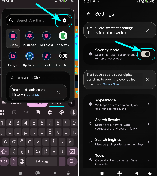 Tο Overlay mode του Quick Search το εντοπίζουμε απευθείας από το εικονίδιο των ρυθμίσεων του, ώστε να το ενεργοποιήσουμε.