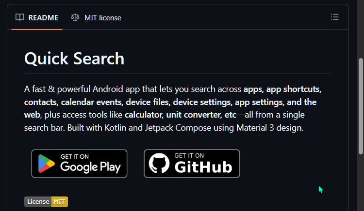 Το Quick Search ανοιχτού κώδικα και χωρίς ads, έρχεται να λύσει αυτό ακριβώς το πρόβλημα, προσφέροντας μια ενιαία μπάρα αναζήτησης για σχεδόν τα πάντα μέσα στη συσκευή μας. Το κατεβάζουμε απευθείας από το Google Play (15ΜΒ), ή από το GitHub.