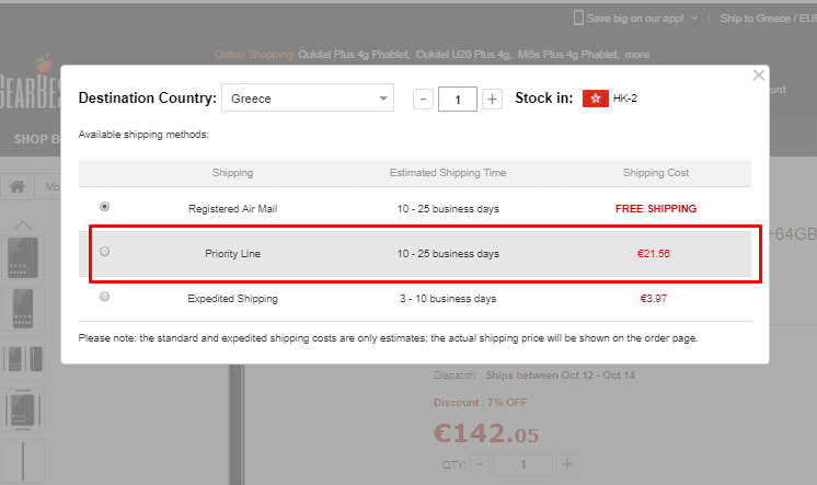 Ενώ υπάρχει δωρεάν αποστολή, ο ενδεδειγμένος τρόπος αποστολής που είναι 100% αποτελεσματικός στο να γλιτώσουμε το τελωνείο είναι η επιλογή Priority Line στα €21.56, την οποία θα βρούμε αποκλειστικά στο GearBest. Το κινητό θα έρθει στο σπίτι μας με courier.
