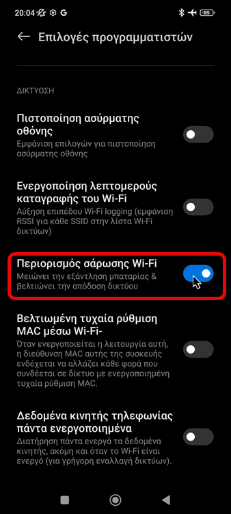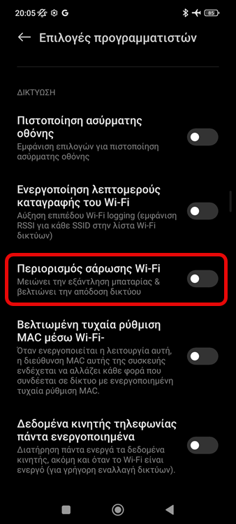 Εντοπίζουμε τον διακόπτη Περιορισμός σάρωσης Wi-Fi (Wi-Fi scan throttling).