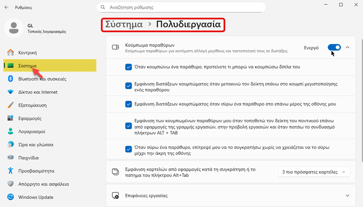 Για να το ενεργοποιήσουμε, μεταβαίνουμε στις Ρυθμίσεις → Σύστημα → Πολυδιεργασία (Multitasking) και βεβαιωνόμαστε ότι η επιλογή Κούμπωμα παραθύρων είναι ενεργοποιημένη.