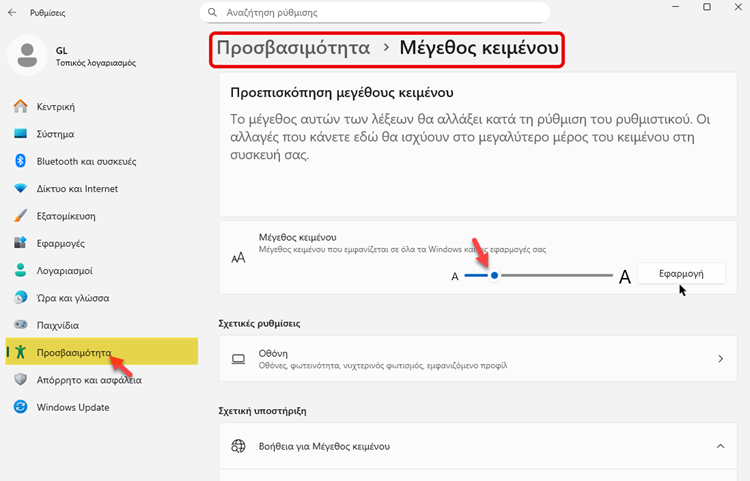 Αν δυσκολευόμαστε να διαβάσουμε το κείμενο στην οθόνη, μπορούμε να αυξήσουμε μόνο το μέγεθος των γραμμάτων, χωρίς να επηρεαστεί η διάταξη (layout) των εικονιδίων, των παραθύρων και των μενού. Έτσι βελτιώνουμε την αναγνωσιμότητα χωρίς να «χαλάμε» την εμφάνιση του συστήματος.