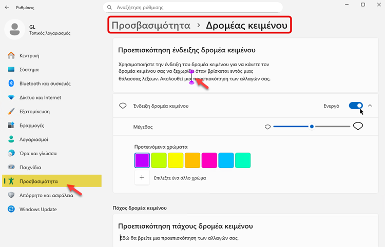 Για να το ενεργοποιήσουμε, μεταβαίνουμε στις Ρυθμίσεις → Προσβασιμότητα → Δρομέας κειμένου και ενεργοποιούμε την επιλογή Ένδειξη δρομέα κειμένου.