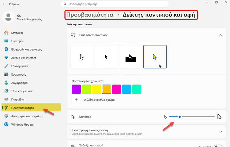 Έπειτα, αυξάνουμε το μέγεθος του δείκτη ή αλλάζουμε το χρώμα του (για παράδειγμα σε έντονο πράσινο ή κίτρινο), ώστε να τον εντοπίζουμε άμεσα στην οθόνη.
