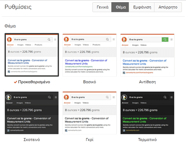 Σε αντίθεση με τη Google, στη DuckDuckGo έχουμε τη δυνατότητα να επιλέξουμε όποιο χρώμα και φόντο μας αρέσει.