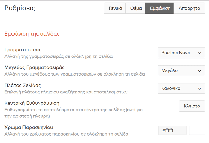 Από εκεί μπορούμε να ρυθμίσουμε κάθε φόντο που υπάρχει, να αλλάξουμε γραμματοσειρά ή χρώμα στα γράμματα, και γενικότερα να πειράξουμε οποιαδήποτε άλλη ρύθμιση εμφάνισης.