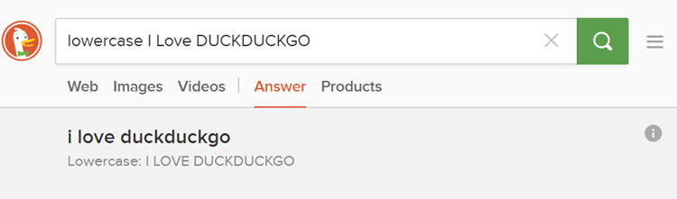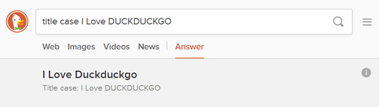 Άλλο ένα χαρακτηριστικό των απαντήσεων της DuckDuckGo είναι η μετατροπή κειμένου σε κεφαλαία ή πεζά.