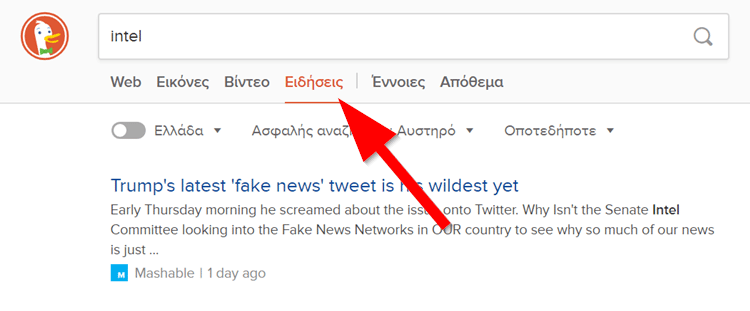 Η Google κάποιες φορές εμφανίζει αυτόματα ειδήσεις όταν κάνουμε μια αναζήτηση. Στη DuckDuckGo δεν ισχύει το ίδιο από προεπιλογή.
