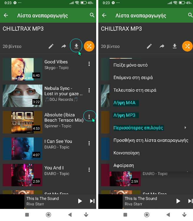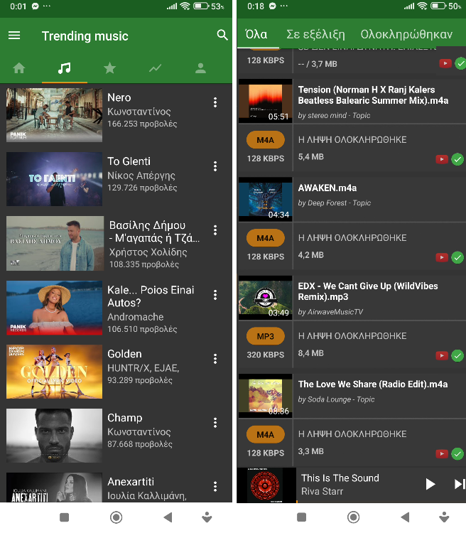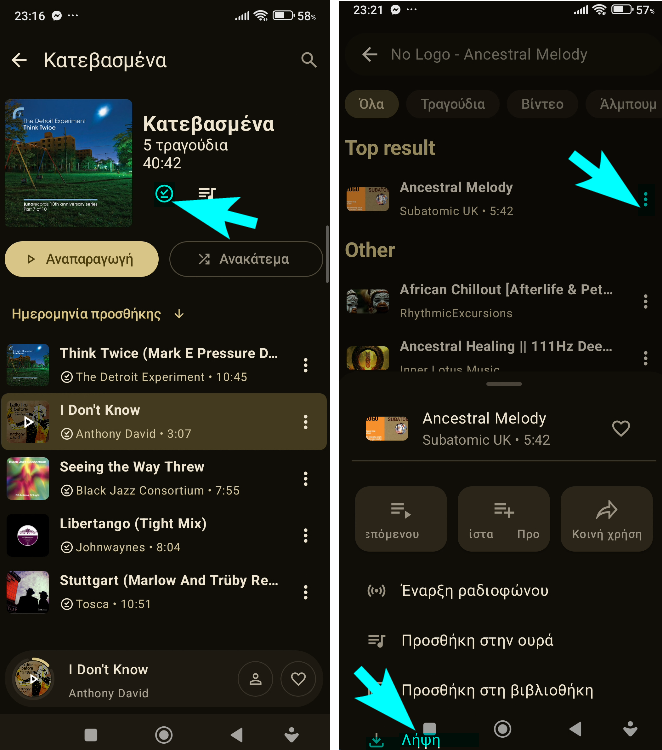 Εναλλακτικά, απλά ανοίγουμε οποιαδήποτε λίστα επιθυμούμε, ή όποια κομμάτια έχουμε αναζητήσει, πατάμε στο κουμπί της λήψης αν θέλουμε να τα ακούμε όλα χωρίς internet, περιμένουμε λίγο να κατέβουν, και όταν δούμε το σχετικό εικονίδιο, είμαστε έτοιμοι να ακούμε μουσική στο κινητό. Χωρίς σύνδεση και χωρίς περιορισμούς.