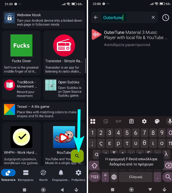 Κατόπιν, απλά αναζητούμε το OuterTune στην αναζήτηση κάτω δεξιά, και το F-Droid θα μας εγκαταστήσει την τελευταία και πιο ενημερωμένη έκδοση του app.