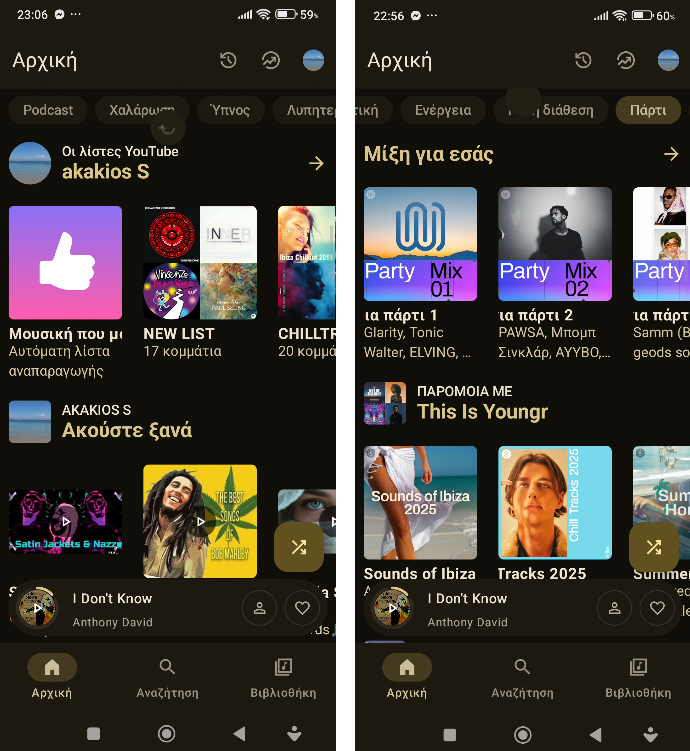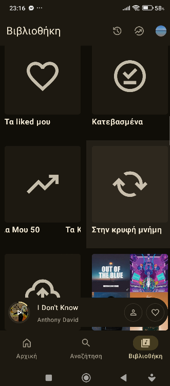 Πατώντας στη Bιβλιοθήκη, και εδώ θα βλέπουμε πάντα στην κορυφή τα αγαπημένα που ορίζουμε, καθώς και ποια κομμάτια έχουμε ήδη κατεβάσει. Αυτό σημαίνει ότι μπορούμε να αναπαράγουμε απευθείας μέσω του player του app, όλη αυτή τη μουσική στο κινητό μας χωρίς να κάνουμε πολλές ενέργειες.