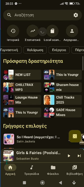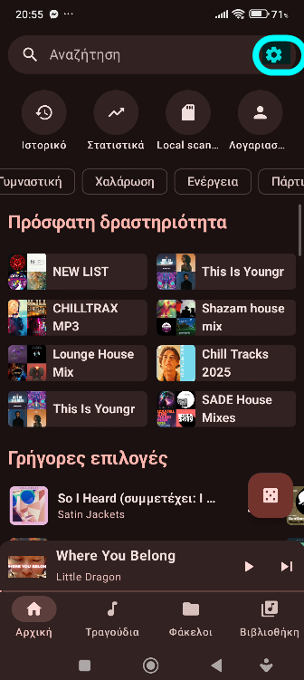 Στην αρχική οθόνη, υπάρχει το πεδίο της αναζήτησης ακριβώς στην κορυφή, ακολουθούμενη από εικονίδια γρήγορης πρόσβασης για το ιστορικό, στατιστικά στοιχεία, είδη μουσικής, και πολλά άλλα.