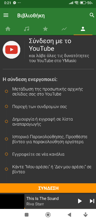 Η εφαρμογή μας επιτρέπει να συνδεθούμε σε οποίο λογαριασμό μας στην Google επιθυμούμε, πατώντας το σχετικό εικονίδιο στην αρχική οθόνη. Αυτό είναι προαιρετικό, καθώς το Ymusic λειτουργεί καλά και χωρίς λογαριασμό.