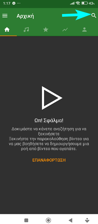 Μόλις τρέξουμε το YMusic για πρώτη φορά, ίσως δούμε ένα σφάλμα στην αρχική οθόνη του. Αυτό οφείλεται στο ότι δεν έχουμε κάνει ακόμη την πρώτη μας αναζήτηση κομματιών. Μόλις αναζητήσουμε κάποιο κομμάτι δεν θα το ξαναδούμε.