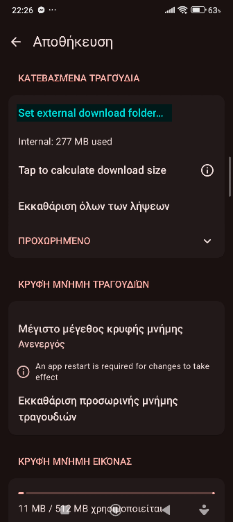 Για πρόσβαση στα κατεβασμένα κομμάτια μέσω κάποιου τρίτου File explorer, θα πρέπει να ορίσουμε έναν εξωτερικό φάκελο (External Downloads). Πρέπει να είναι νέος, άδειος (να μην έχει μέσα κάποια άλλα σημαντικά αρχεία μας), και να βρίσκεται σε κάποια SD κάρτα που έχουμε στο κινητό.