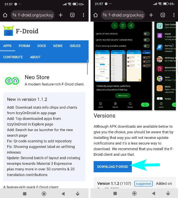 Εναλλακτικά, το κατεβάζουμε από το F-Droid / Neo Store, όπου οι ενημερώσεις θα γίνονται με πιο αυτόματο τρόπο. Αν δεν το γνωρίζουμε ήδη, πρόκειται για εναλλακτικό κατάστημα εφαρμογών που προσφέρει μόνο FOSS apps, δηλαδή ελεύθερες και ανοιχτού κώδικα εφαρμογές (Free and Open Source Software).