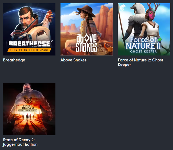 Συγκεκριμένα, πληρώνοντας από 7,39€ και πάνω, παίρνουμε το “Breathedge”, το “Above Snakes”, το “Force of Nature 2: Ghost Keeper”, και το “State of Decay 2: Juggernaut Edition”.