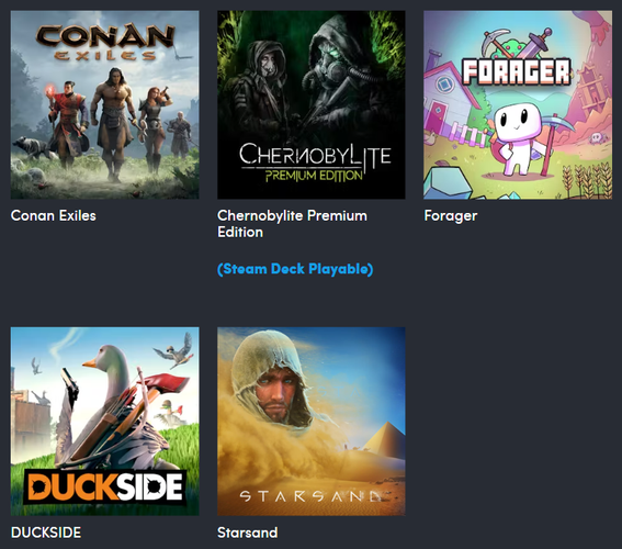 Την ίδια στιγμή, δίνοντας τουλάχιστον 12,67€ αγοράζουμε επιπλέον το “Conan Exiles”, το “Chernobylite Premium Edition”, το “Forager”, το “DUCKSIDE”, και το “Starsand”.