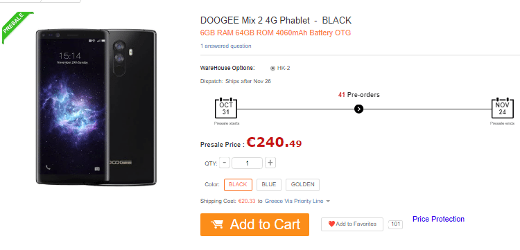 Το DOOGEE Mix 2 4G κοστίζει €240.49 για προπαραγγελία και διατίθεται σε τρία χρώματα (μαύρο, μπλε, χρυσό), στην ίδια τιμή.