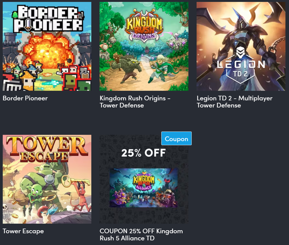 Συγκεκριμένα, πληρώνοντας από 7,52€ και πάνω, παίρνουμε το “Border Pioneer”, το “Kingdom Rush Origins – Tower Defense”, το “Legion TD 2 – Multiplayer Tower Defense”, το “Tower Escape”, και κουπόνι για την αγορά του Kingdom Rush 5 Alliance TD με 25% έκπτωση.