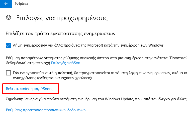 Στο Windows Update, θα εντοπίσουμε τις “Επιλογές για προχωρημένους”, και στη συνέχεια κάνουμε κλικ στον σύνδεσμο “Βελτιστοποίηση παράδοσης”.