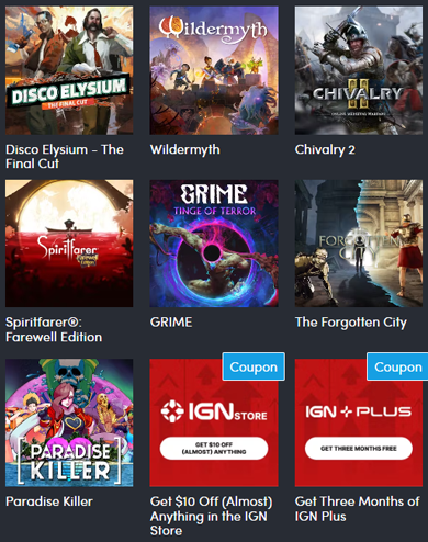 Συγκεκριμένα, πληρώνοντας από 15,10€ και πάνω, παίρνουμε το “Disco Elysium – The Final Cut”, το “Wildermyth”, το “Chivalry 2”, το “Spiritfarer®: Farewell Edition”, το “GRIME”, το “The Forgotten City”, το “Paradise Killer”, ένα κουπόνι 10 δολαρίων για αγορές από το IGN Store, και ένα κουπόνι για τρεις μήνες IGN Plus.