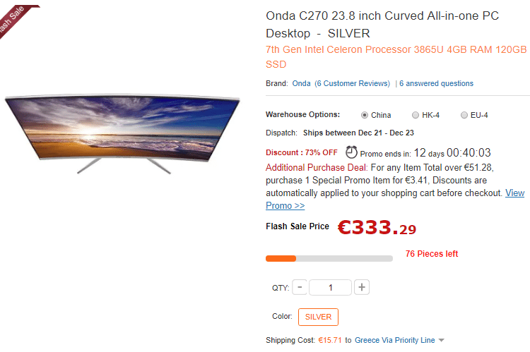 Η τιμή του Curved Onda C270 23.8” All-in-one θα βρίσκεται για πολύ περιορισμένα κομμάτια στα €333.29. Μπορούμε να το αγοράσουμε από εδώ. Συνοδεύεται από πληκτρολόγιο και ποντίκι.